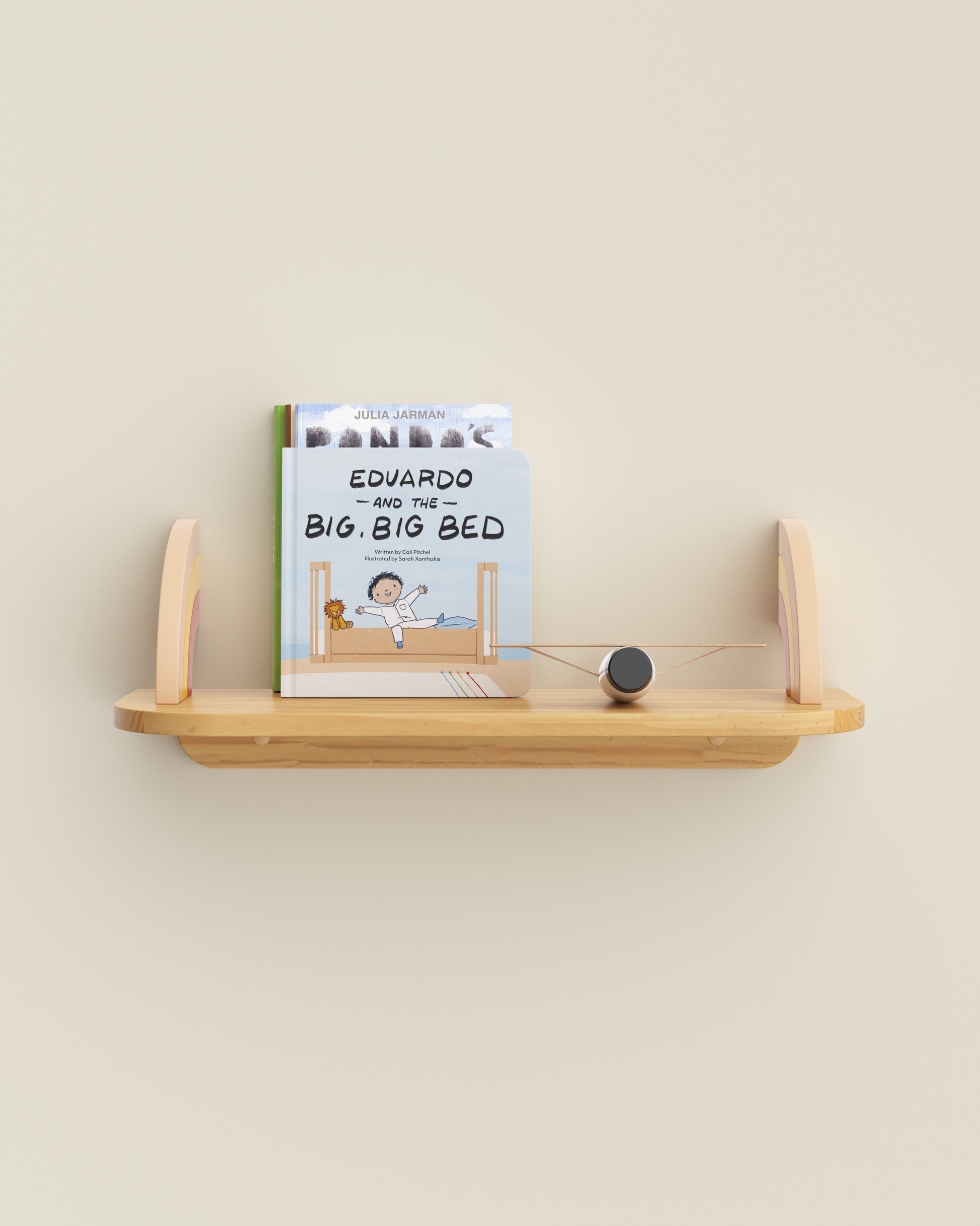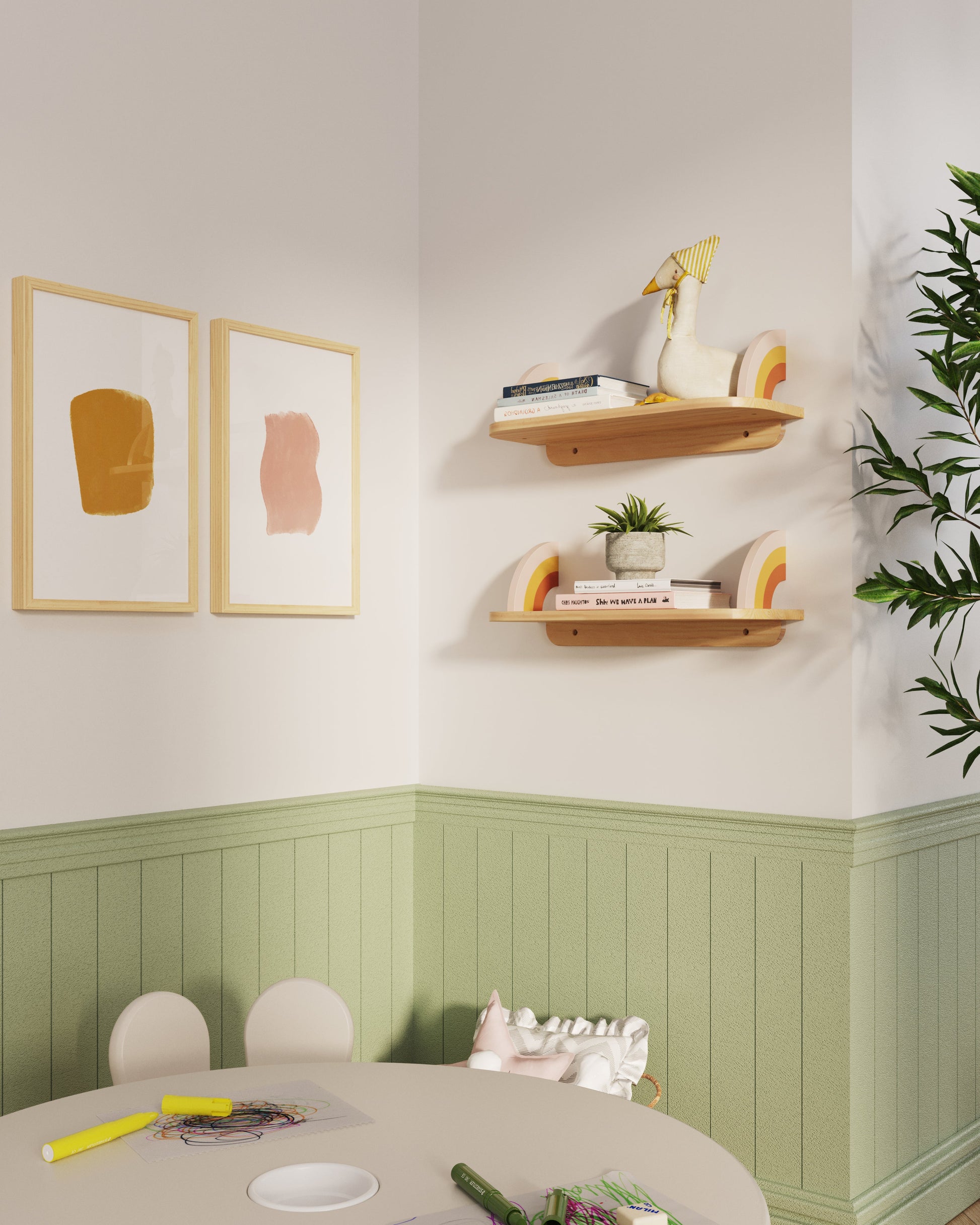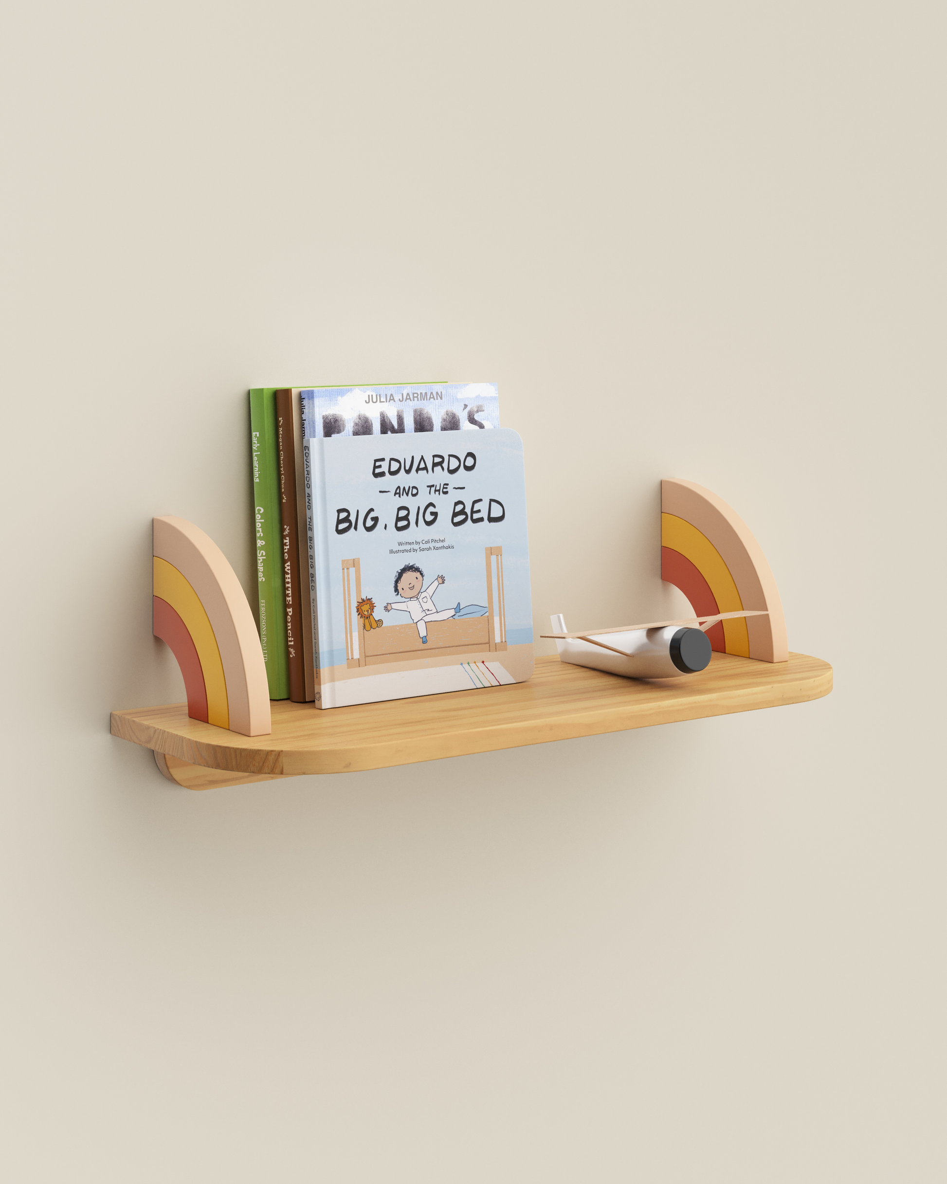 Cette étagère flottante en bois présente deux arcs-en-ciel ludiques à chaque extrémité.
