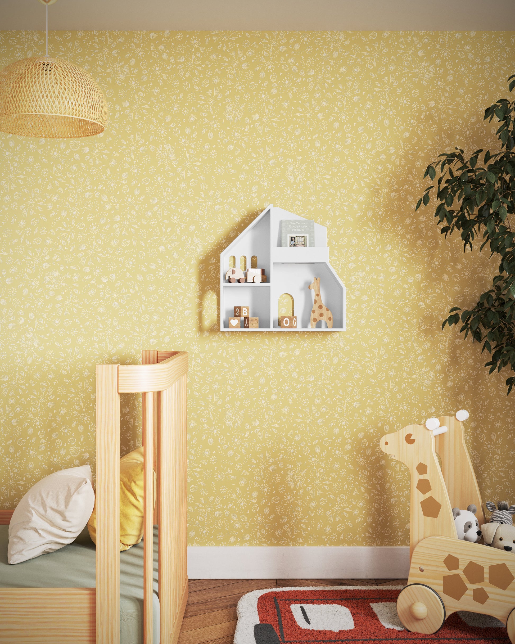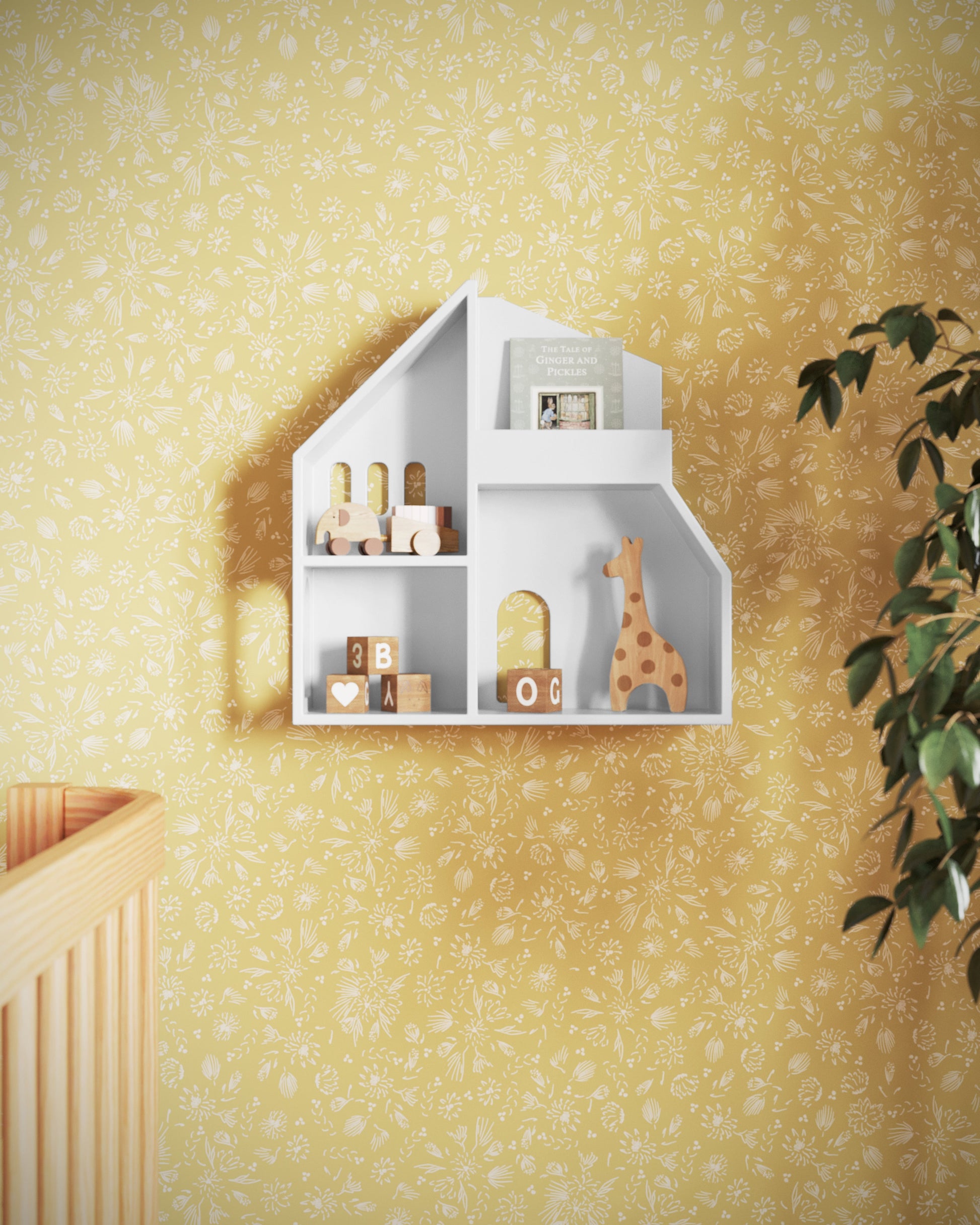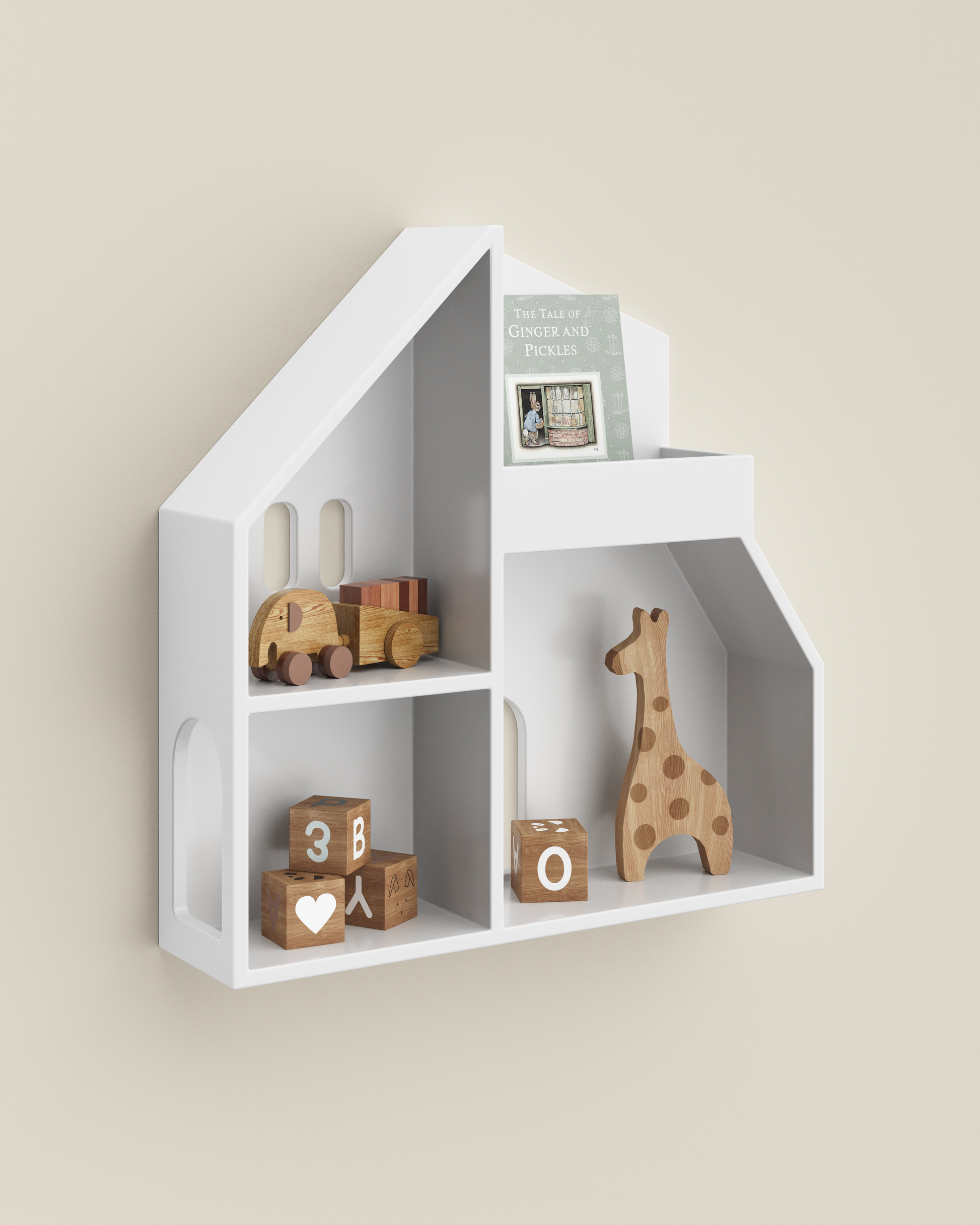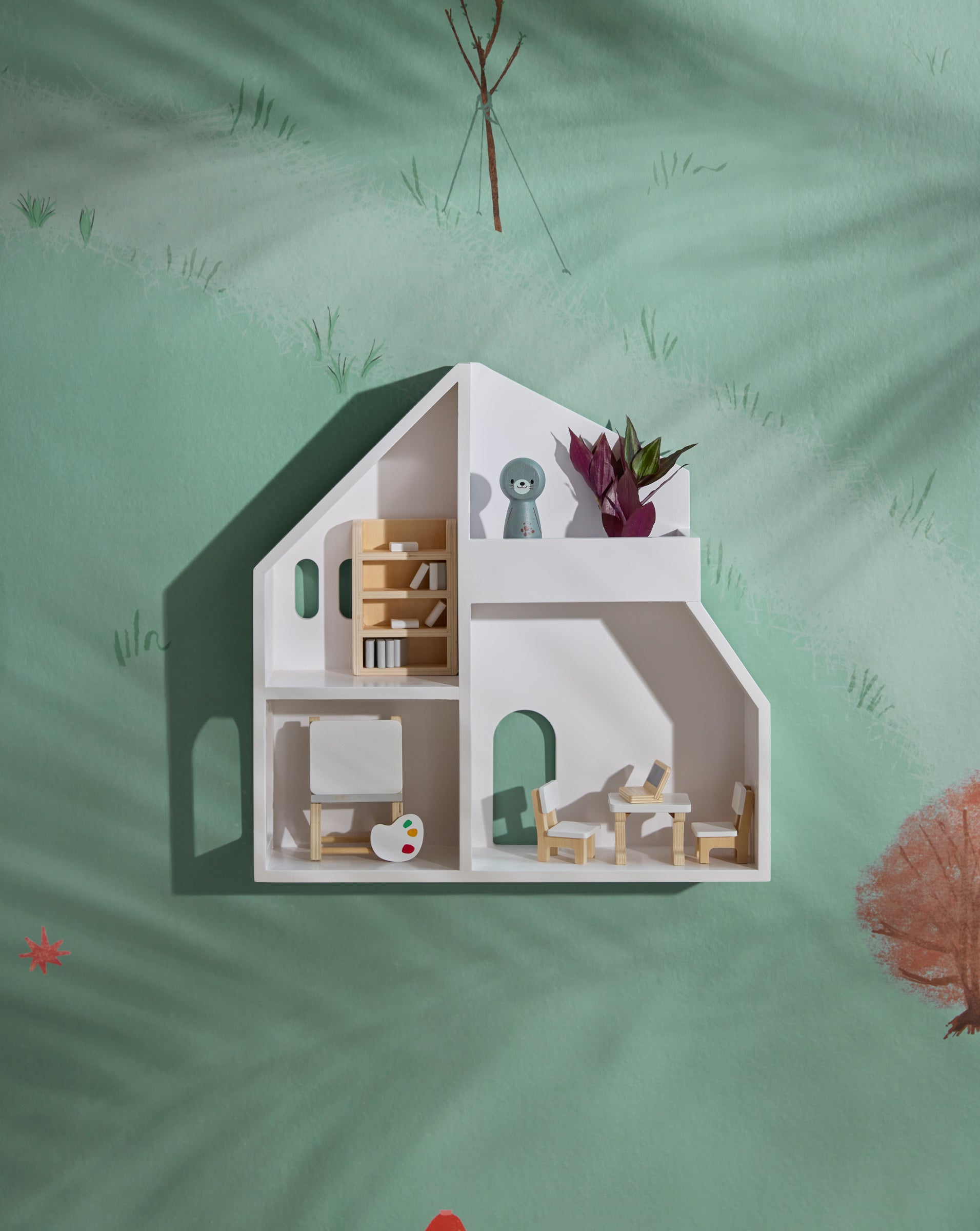 Cette étagère flottante en bois en forme de maison de poupée est conçue pour exposer tous vos trésors.