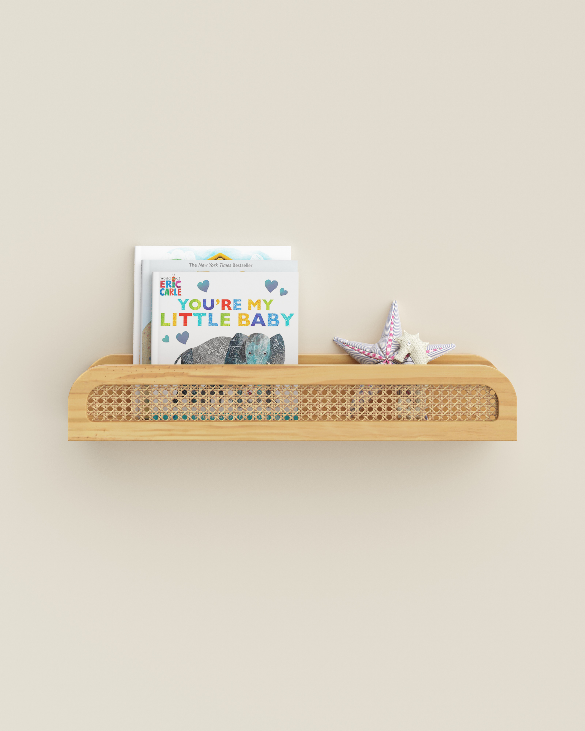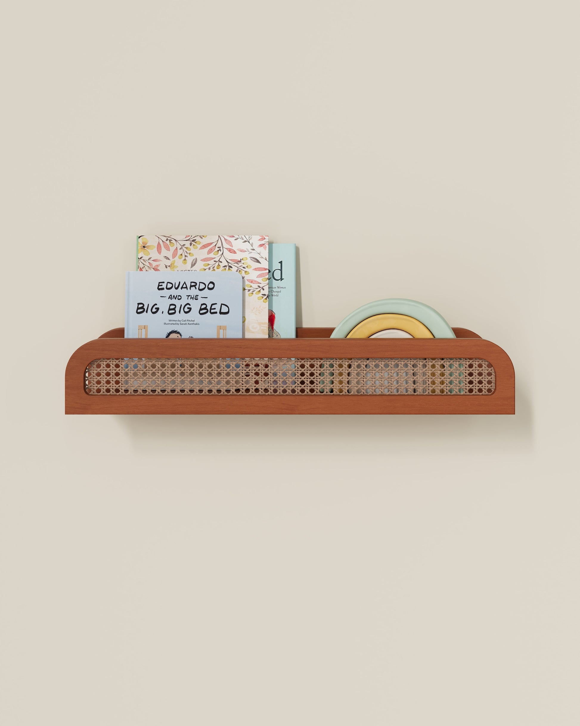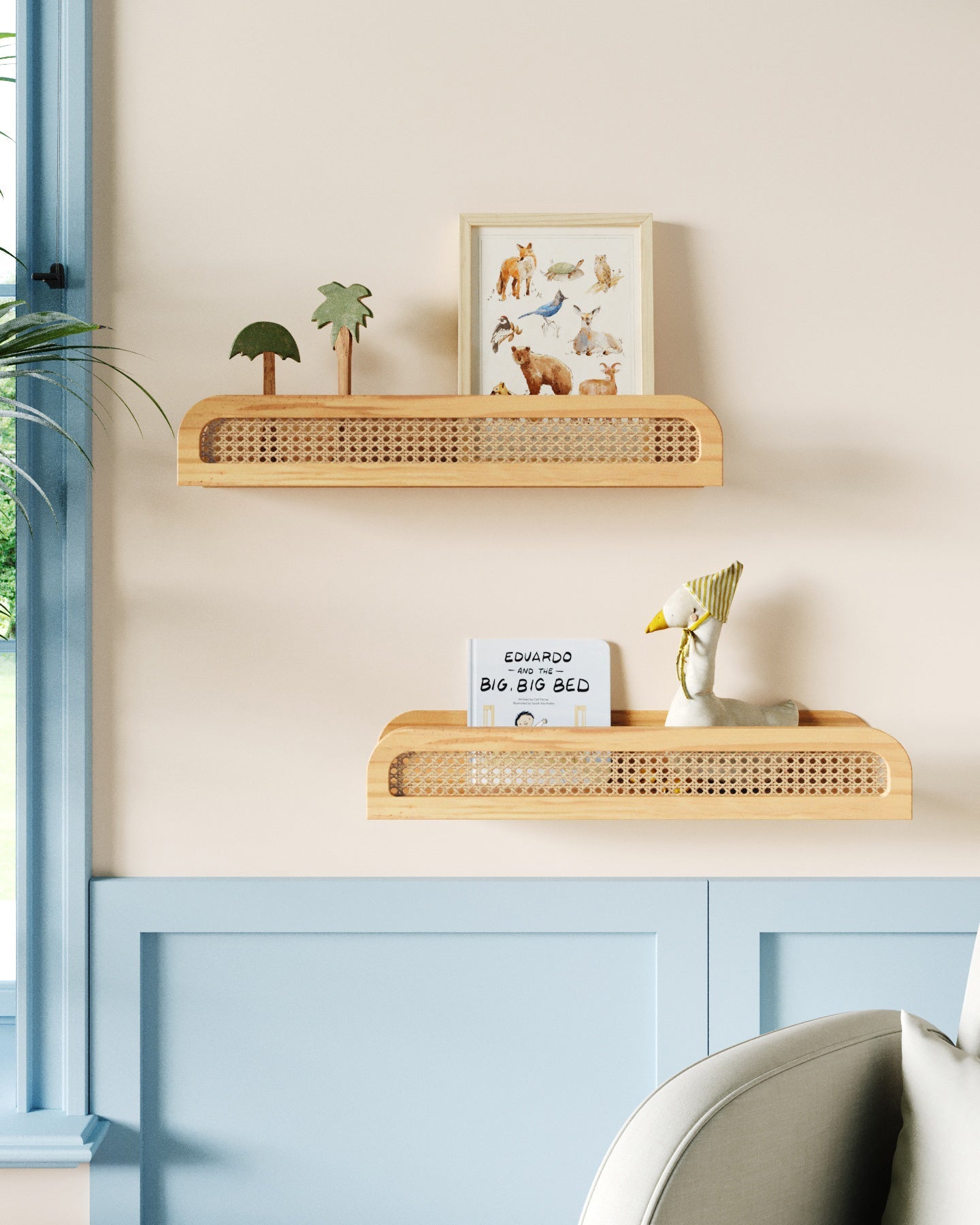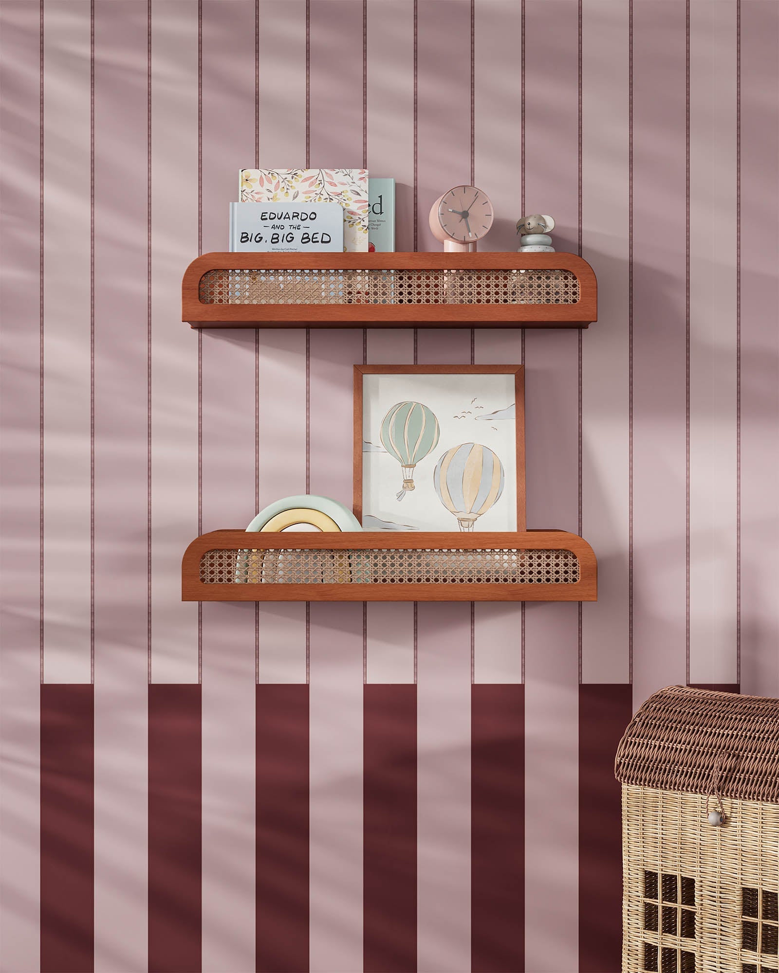 Cette étagère flottante en bois présente une façade en rotin pour une ambiance chic et balnéaire.