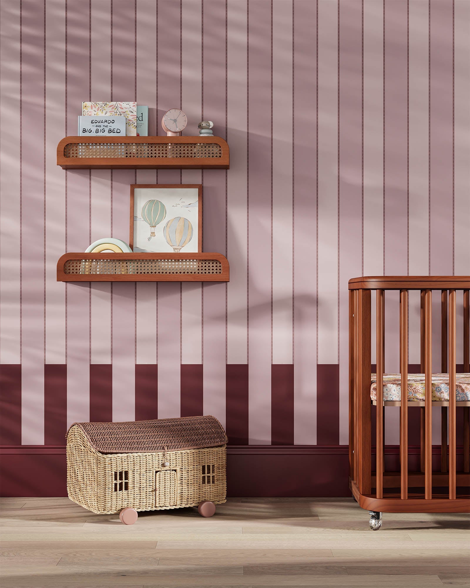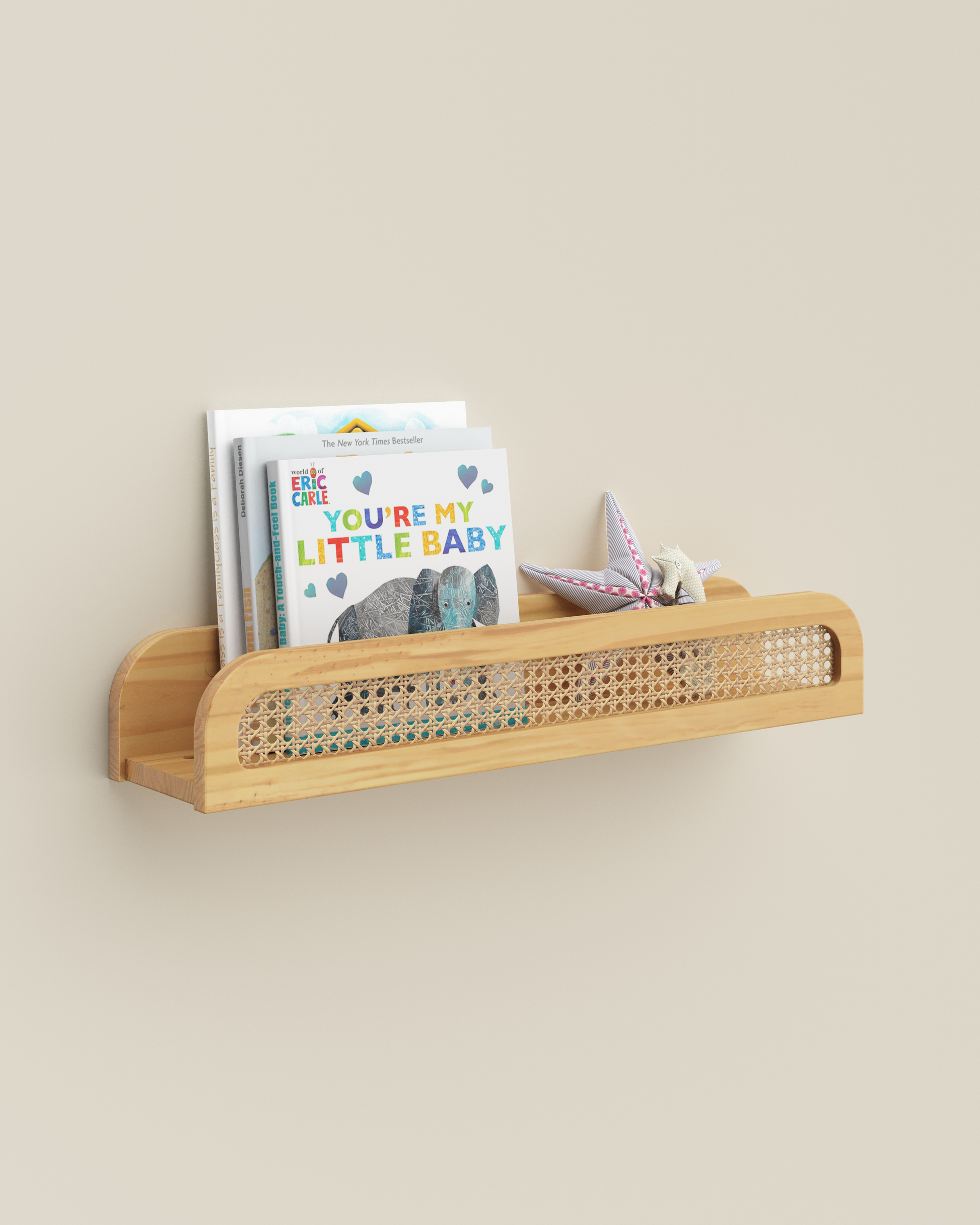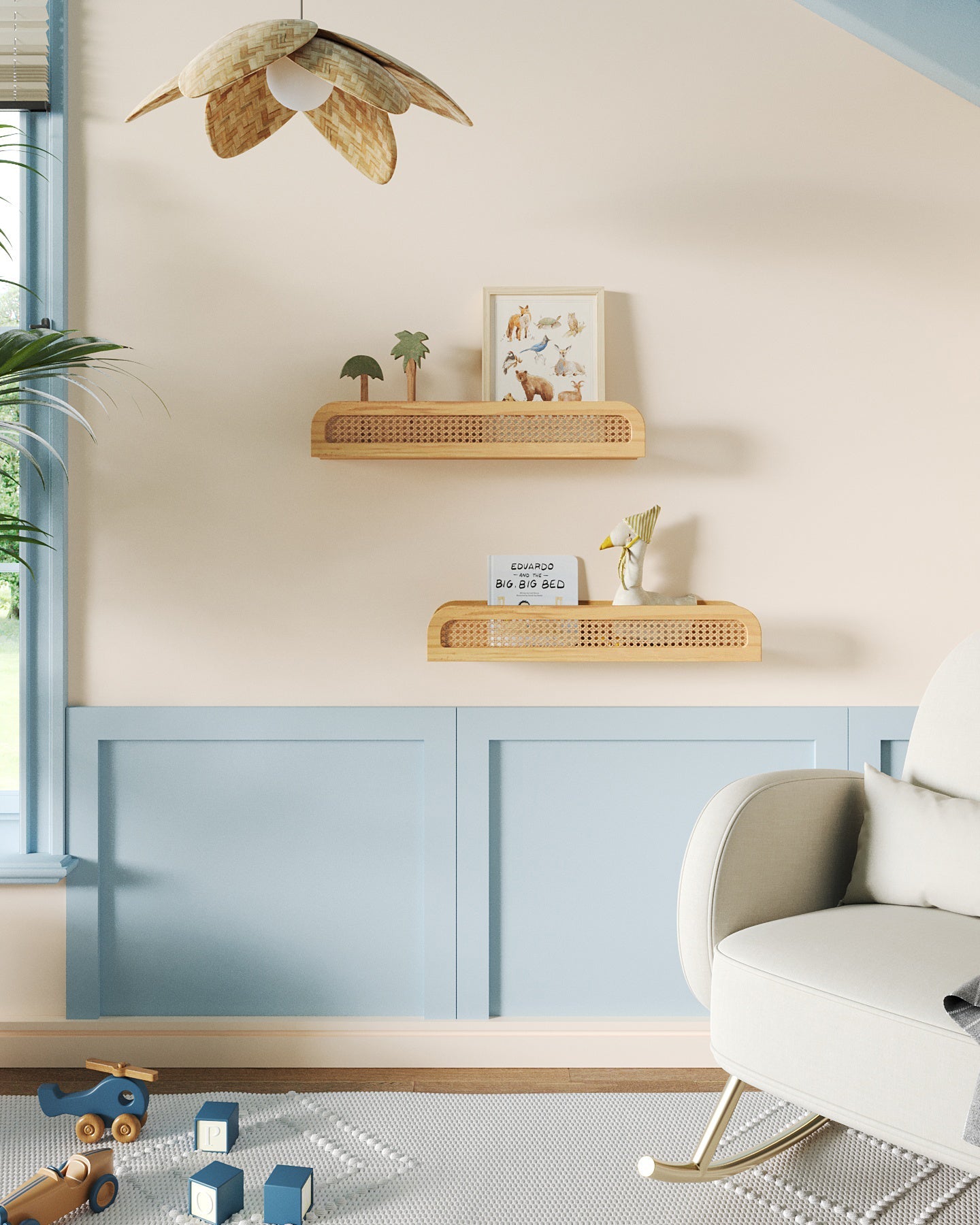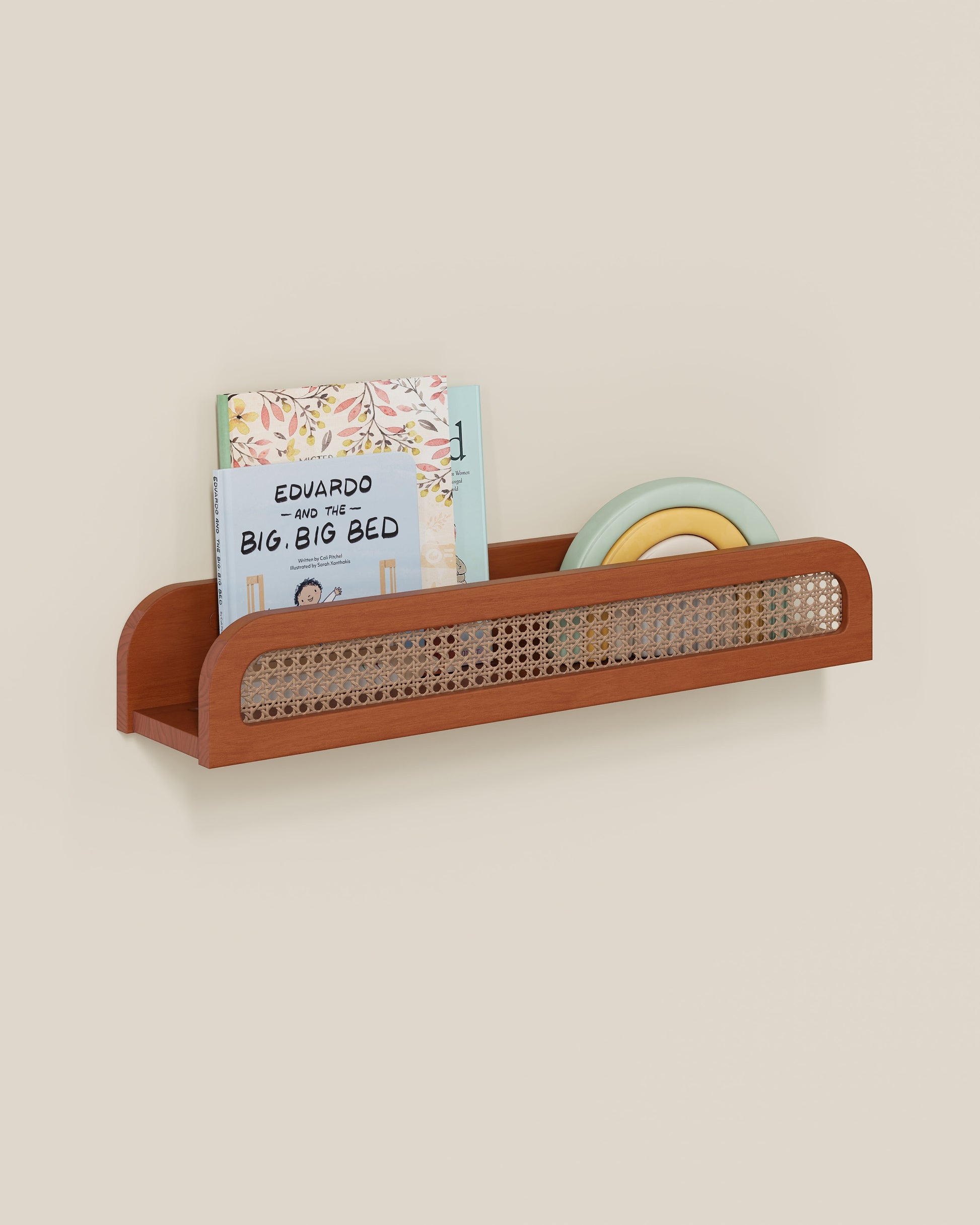 Cette étagère flottante en bois présente une façade en rotin pour une ambiance chic et balnéaire.