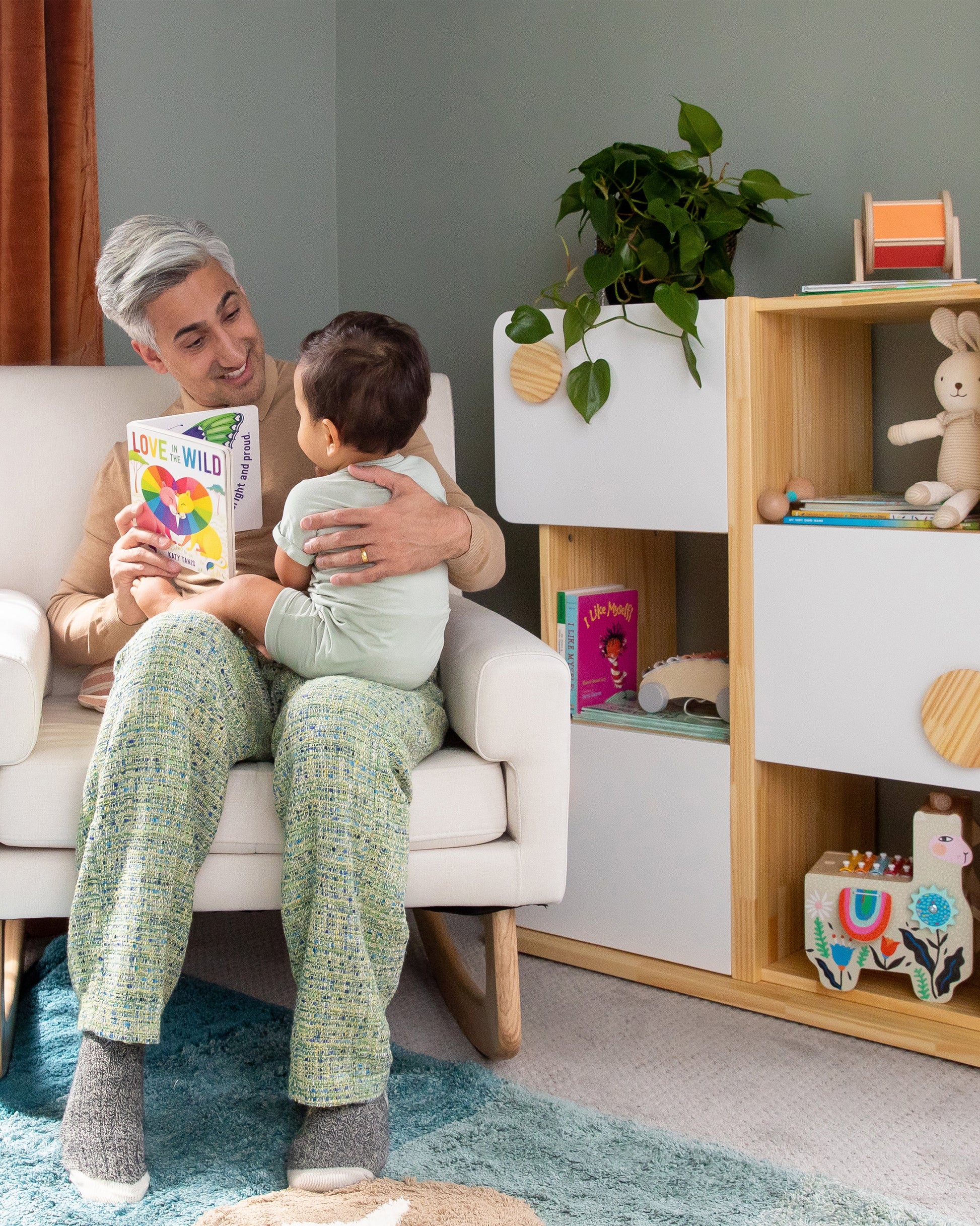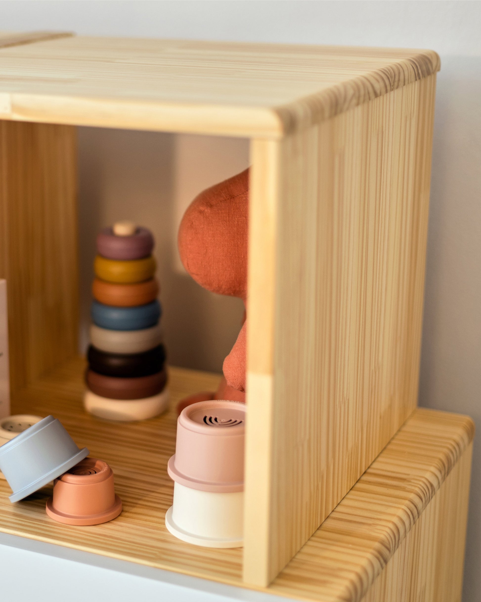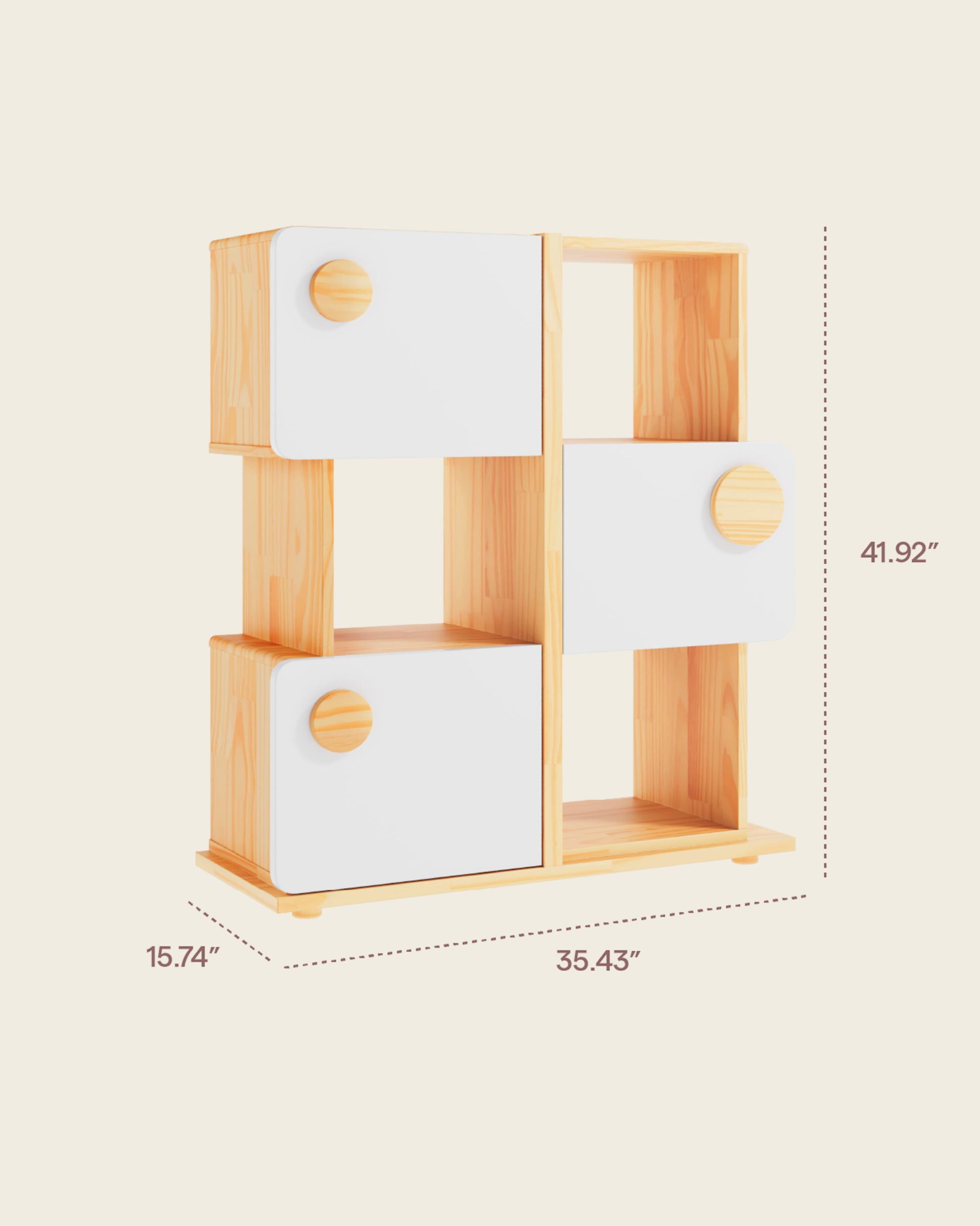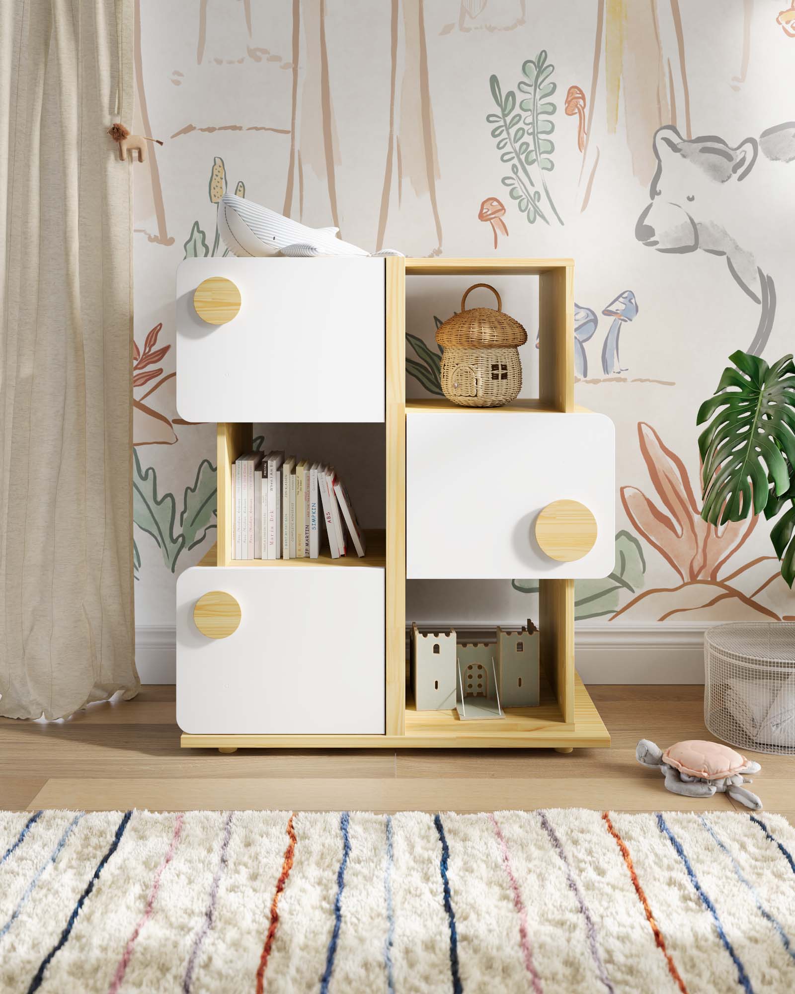 L'étagère Cache-cache présente un design charmant avec trois étagères ouvertes et trois niches, parfait pour allier rangement et jeu !