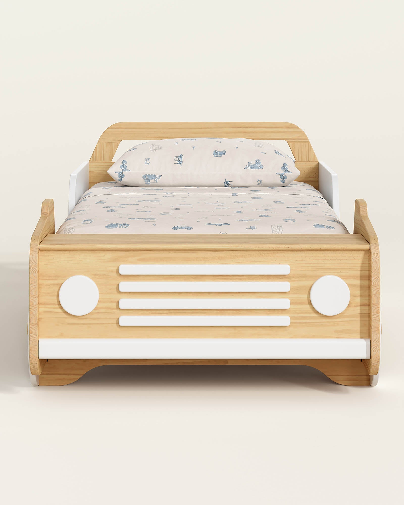 Avec ses fausses roues, ses phares et sa calandre, ainsi que sa capote en forme de coffre à jouets, ce lit est le point de départ de l'imagination et (bien sûr) du sommeil.