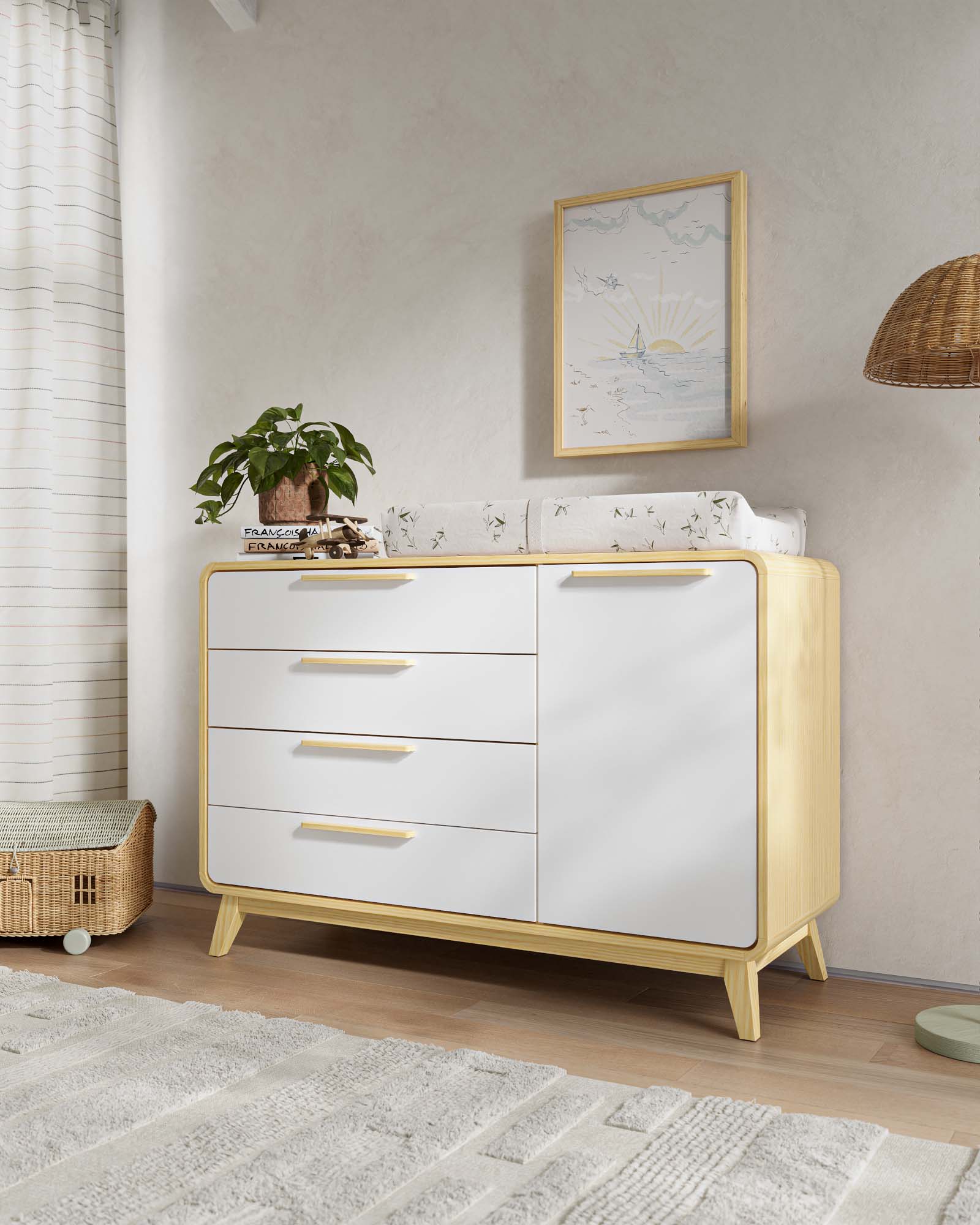 Ce meuble indispensable pour la chambre de bébé évolue avec votre enfant. Spacieux, il peut servir de table à langer et offre de nombreux rangements : quatre grands tiroirs et un placard latéral. À l’intérieur, une tringle amovible permet de suspendre facilement les vêtements ou de ranger les petits objets du quotidien. Fabriqué à partir de matériaux de haute qualité, il allie style et fonctionnalité pour accompagner votre famille de la naissance à l’enfance et même au-delà.
